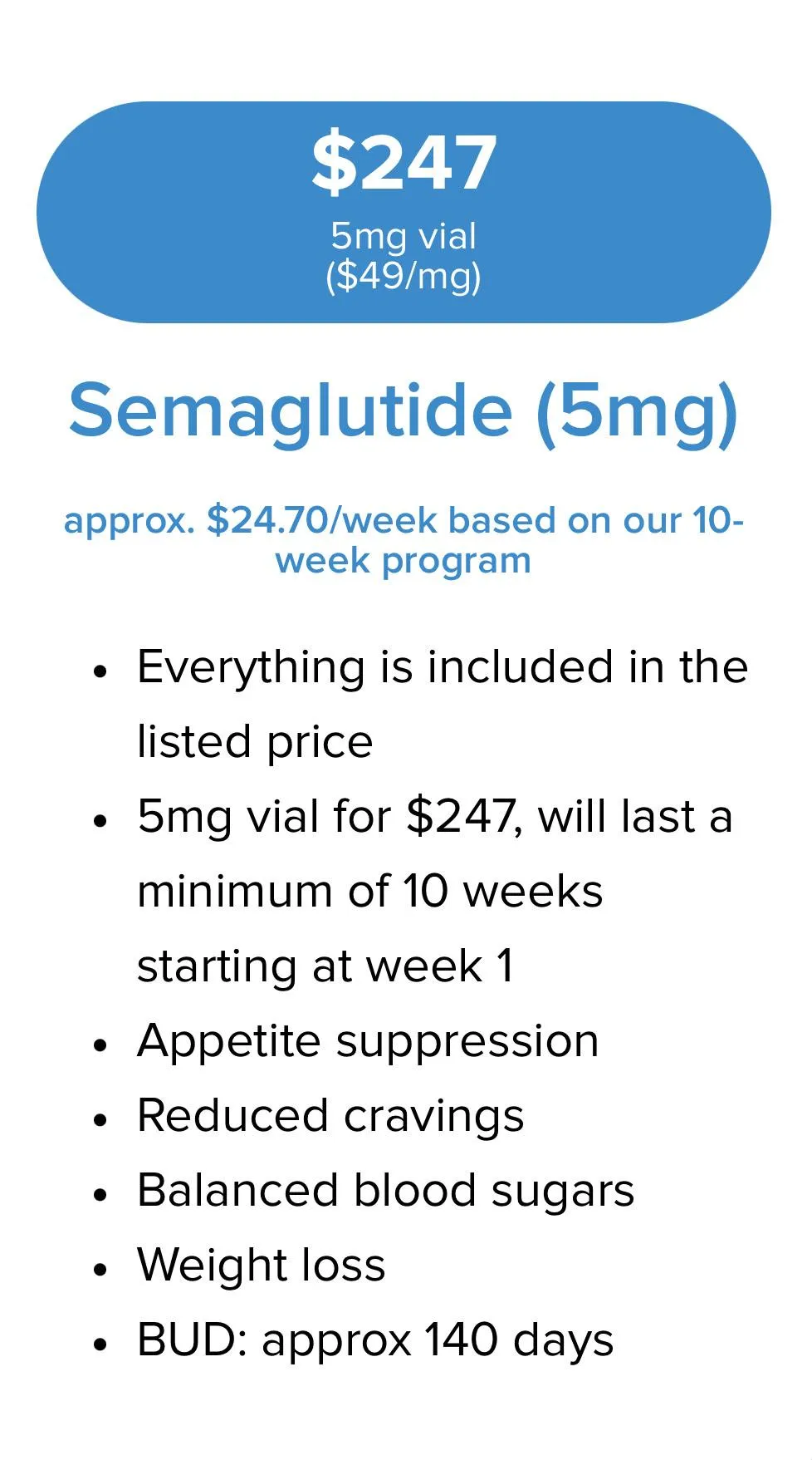 A 5 mg vial will last a minimum of 10 weeks, starting at week 1